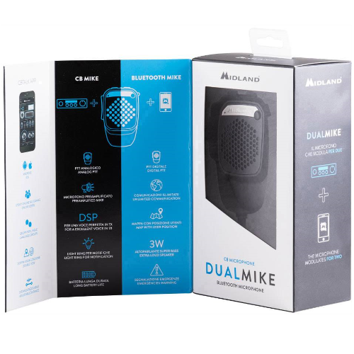 Το Dual Mike της Midland έχει την δυνατότητα να συνδέεται μέσω Bluetooth στο κινητό και σε CB ALAN 48 PLUS/PRO με βύσμα 4 pin. Για να συνδεθεί με το κινητό τηλέφωνο χρειάζεται να γίνει και λήψη της δωρεάν εφαρμογής CB TALK. Επίσης, το μικρόφωνο διαθέτει ισχυρά ηχεία 3 watt και επεξεργαστή σήματος DSP για τέλεια ποιότητα φωνής.