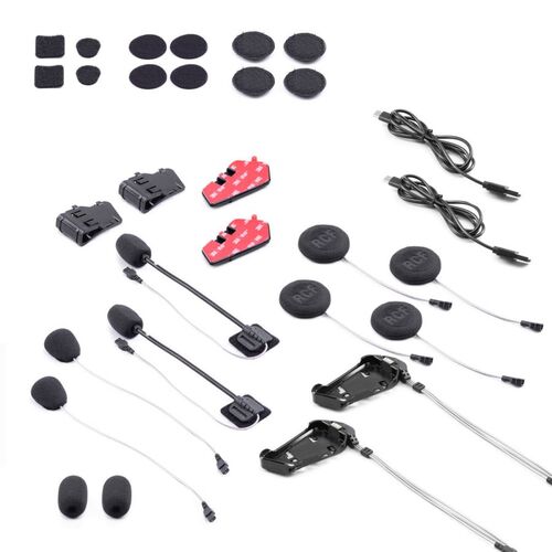 Περιεχόμενα συσκευασίας: Δύο BT R1 MESH, δύο κιτ ήχου με ηχεία 40mm υψηλής απόδοσης από την RCF, τέσσερα δερμάτινα προστατευτικά μαξιλαράκια μπάσων, τέσσερις αποστάτες ηχείων, δύο κιτ μικροφώνων αποτελούμενο από ένα ενσύρματο μικρόφωνο για κλειστό κράνος και ένα μικρόφωνο boom με βραχίονα για ανοιγόμενο κράνος, δύο κιτ γρήγορης εγκατάστασης με μία βάση με αυτοκόλλητη ταινία διπλής όψεως για στήριξη στα κράνη και ένα καλώδιο USB-C.